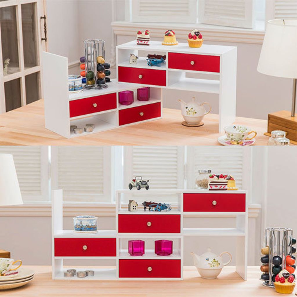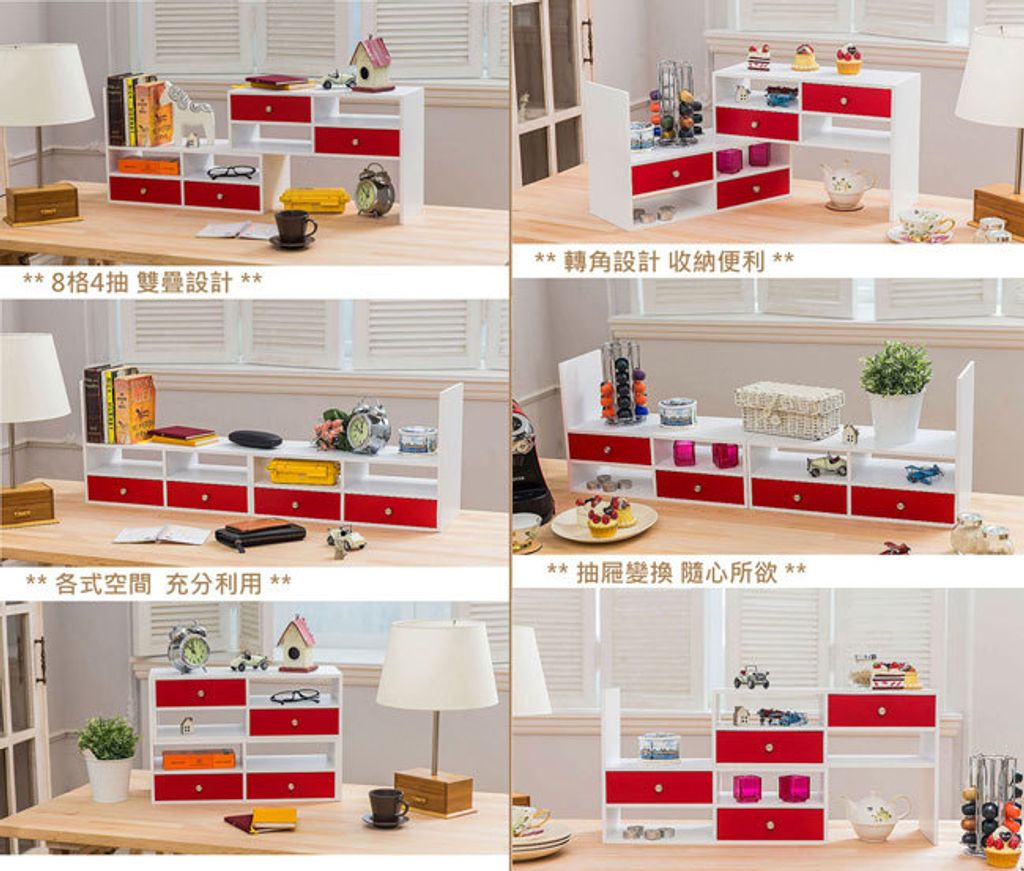 八格四抽設計,以四個抽屜可隨需求移動調整,書籍、文具、公仔立即定位,甚至零散小物通通一網打盡,便利的收納抽屜機能,讓您的廳房優雅美觀,是書櫃也是餐廚收納櫃,最愛的咖啡杯、茶具組甚至是古玩物一併收藏擺飾。